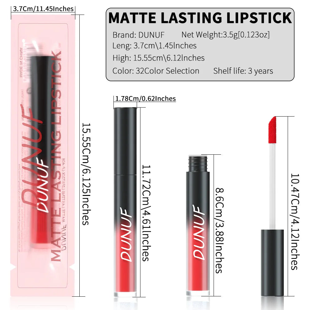 The 32 Color Lipstick Matte Lasting Lip Gloss is a range of long-lasting lipsticks, available in 32 vibrant and bold colors. This moisturizing, matte lipstick offers an ultra-pigmented finish while keeping your lips nourished and soft. It's perfect for special occasions like Halloween, parties, or any event where you want to make an impression. Its transfer-proof formula ensures long-lasting wear without leaving marks on your glasses or clothes.