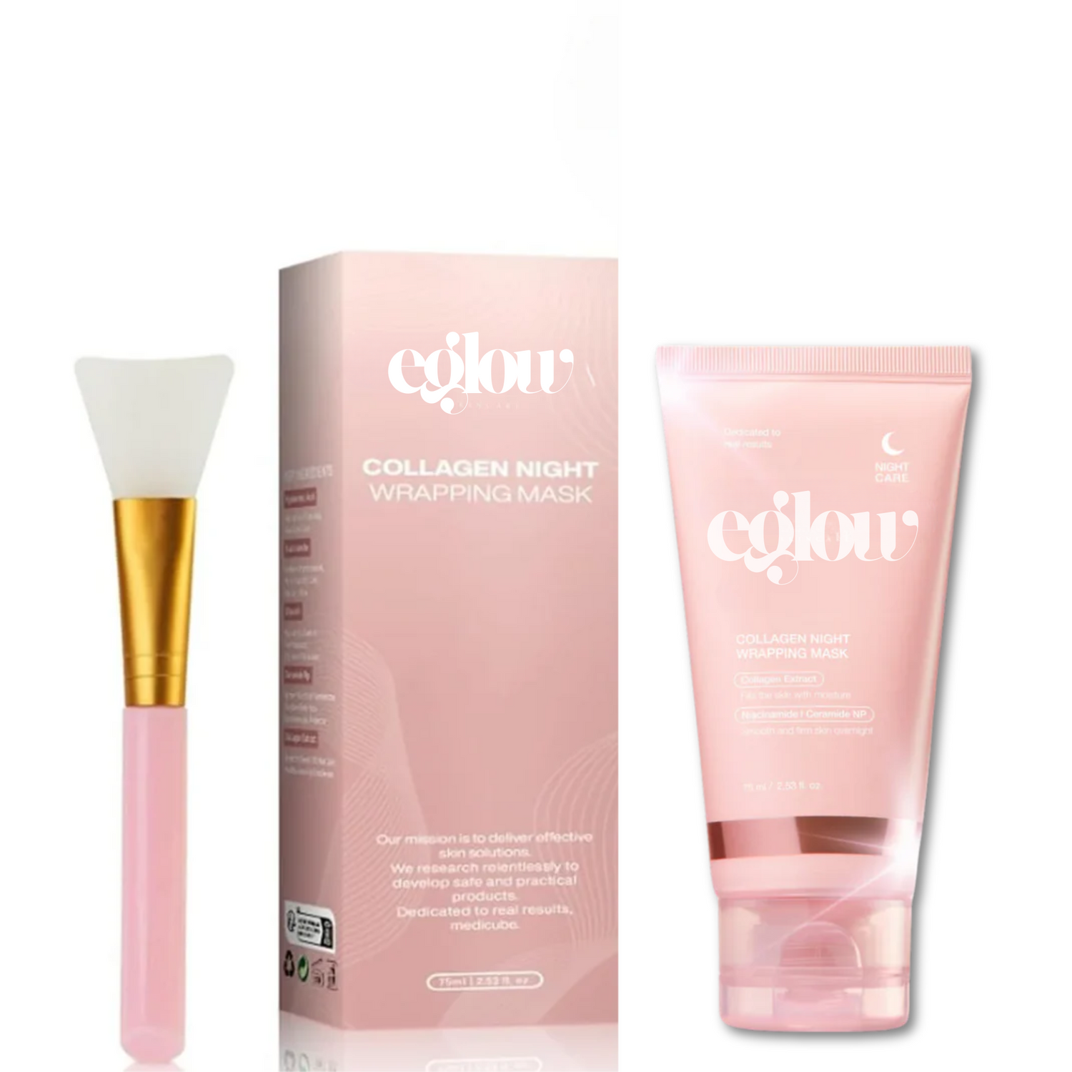 Transform your skin overnight with the eGlow™ Collagen Night Wrapping Mask . Enriched with collagen extract and niacinamide, this intensively hydrating mask penetrates deep to nourish, firm, and smooth skin. Its innovative formula helps restore skin elasticity while minimizing the appearance of pores. Wake up to glowing, soft, and revitalized skin. Comes with a silicone applicator brush for an at-home spa experience. Suitable for all skin types.